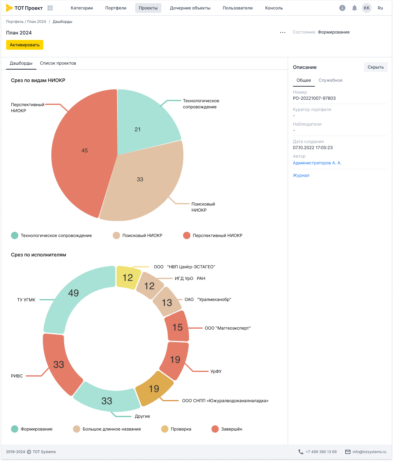 - для возможности применения системы ТОТ Проект в цифровизации проектного управления в различных отраслях и сферах деятельности были разработаны и внедрены конструкторы форм бизнес-объектов, печатных форм документов, бизнес-процессов (BPM) и жизненных циклов объектов, реестров и витрин данных для мониторинга;